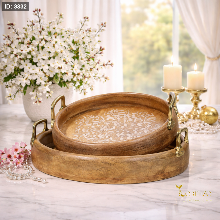 صواني تقديم خشبية فاخرة بتصميم أنيق وعصري، تضيف لمسة دافئة ومميزة لديكور منزلك. مصنوعة من خشب عالي الجودة بملمس طبيعي جذاب، مع مقابض معدنية ذهبية متينة تمنحها فخامة وسهولة في الحمل.