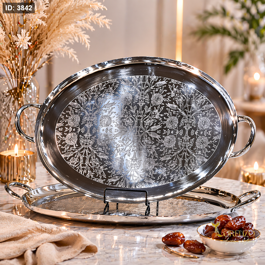 أضيفي لمسة فخامة إلى ضيافتك مع طقم الصواني البيضاوي المصمم بنقشة ورد راقية تعكس الذوق الرفيع. مثالي لتقديم القهوة، الشاي، والحلويات بأسلوب أنيق يلفت الأنظار.