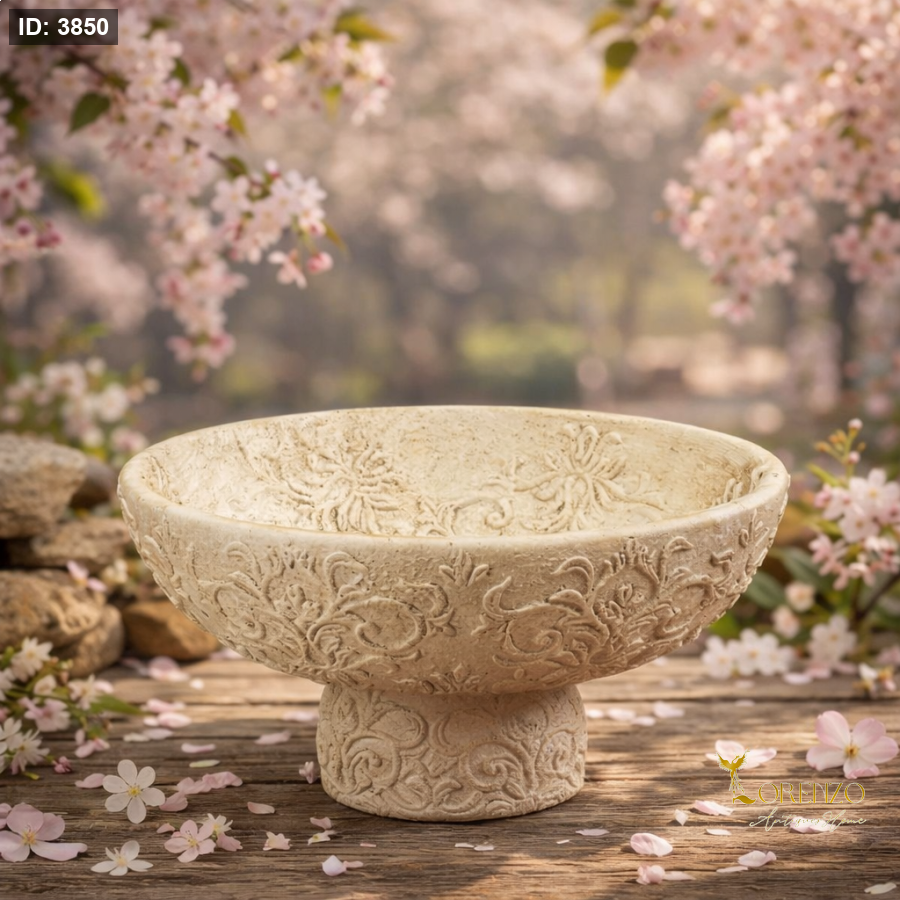 الوعاء مصنوع بتصميم عميق وواسع، مما يجعله مناسبًا لعدة استخدامات ديكورية، سواء لعرض الورود، الفواكه، أو كقطعة فنية مستقلة. يرتكز على قاعدة أسطوانية متينة مزخرفة بنفس النقوش، تضيف له ثباتًا وأناقة إضافية عند العرض.