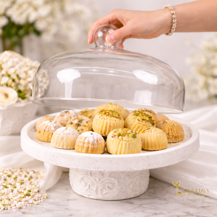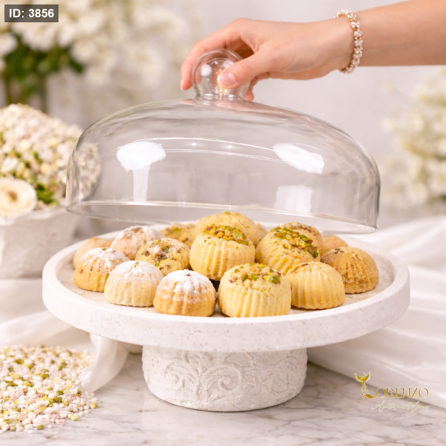 ستاند تقديم فاخر بقطر 29 سم مع غطاء زجاجي أنيق، مصمم ليضفي لمسة راقية على طاولة الضيافة. يتميز بقاعدة بلون أبيض ناعم مزخرفة بنقوش كلاسيكية دقيقة تعكس فخامة التصميم وجودة التفاصيل.
