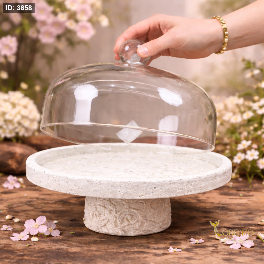 ستاند تقديم فاخر مع غطاء زجاجي، بتصميم أنيق يجمع بين الفخامة والنعومة ليمنح طاولة الضيافة لمسة مميزة. يتميز بقاعدة بلون عاجي طبيعي مع تفاصيل زخرفية بارزة تضيف طابع كلاسيكي راقٍ يناسب مختلف الديكورات.