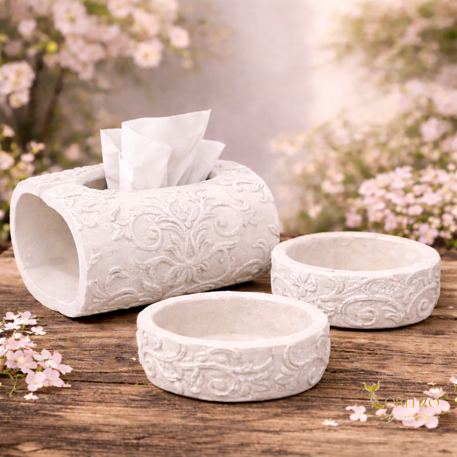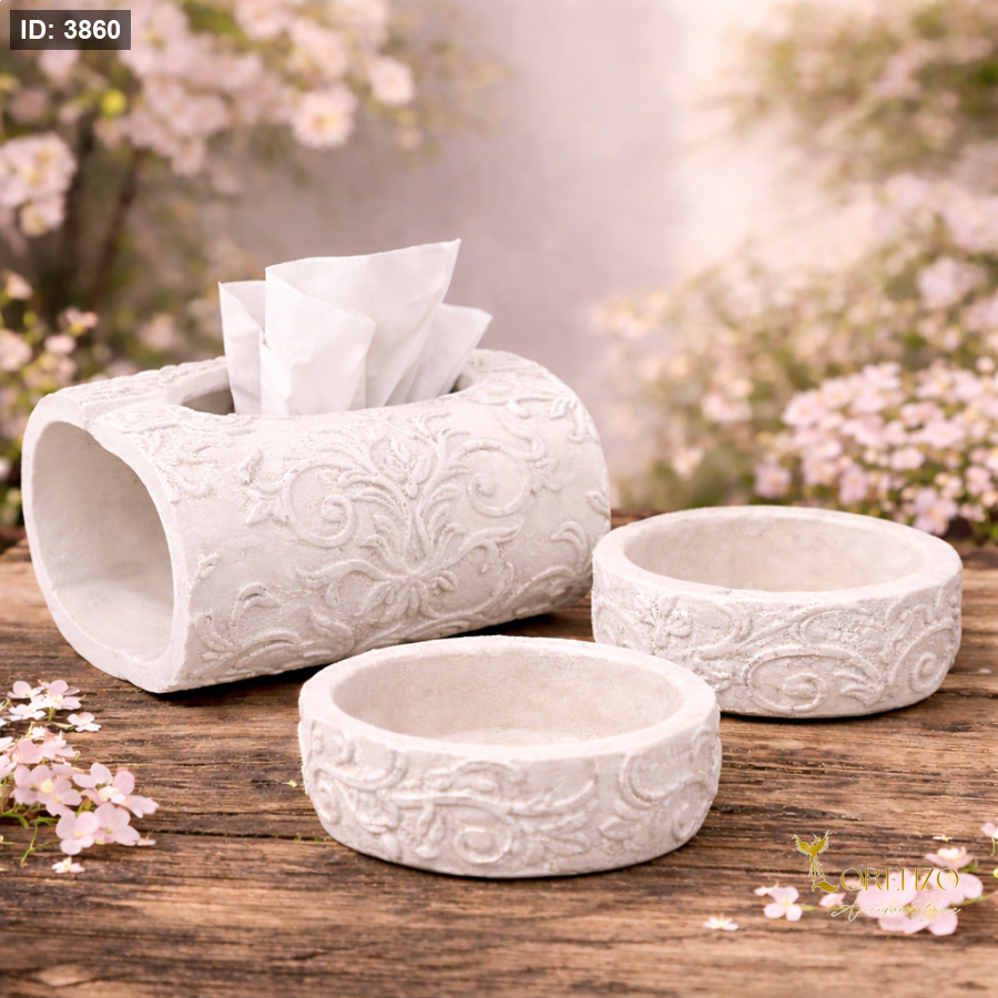طقم ديكور أنيق مكوّن من علبة محارم مع مكتتين (2)، بتصميم فاخر مستوحى من الطراز الكلاسيكي الراقي. يتميز الطقم بلونه الأبيض العاجي ونقوشه الزخرفية البارزة التي تضيف لمسة فخامة وجمال لأي مساحة.