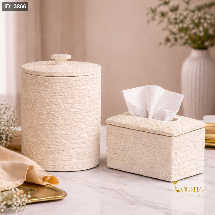 تأتي علبة المحارم بفتحة علوية عملية لسهولة سحب المناديل، مع تصميم يحافظ على ترتيبها بشكل أنيق. كما تحتوي على سلة أسطوانية متعددة الاستخدامات، يمكن استخدامها كسلة مهملات صغيرة أو لتخزين الأغراض اليومية، مما يجعل الطقم عملي ومتكامل.