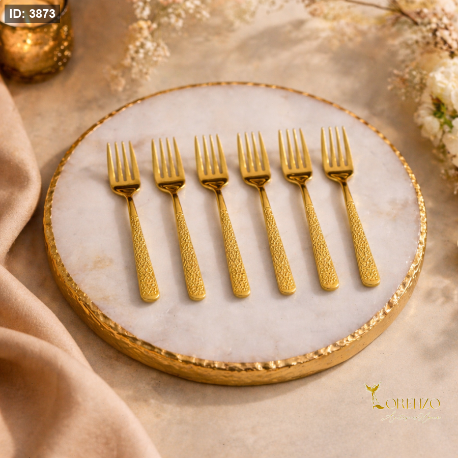 طقم شوك طعام فاخر بتصميم أنيق ولون ذهبي لامع، يضيف لمسة راقية لأي مائدة. يتميز كل شوك بنقوش دقيقة على المقبض تعكس الفخامة والدقة في التفاصيل، مما يجعله مناسبًا للاستخدام اليومي أو المناسبات الخاصة.