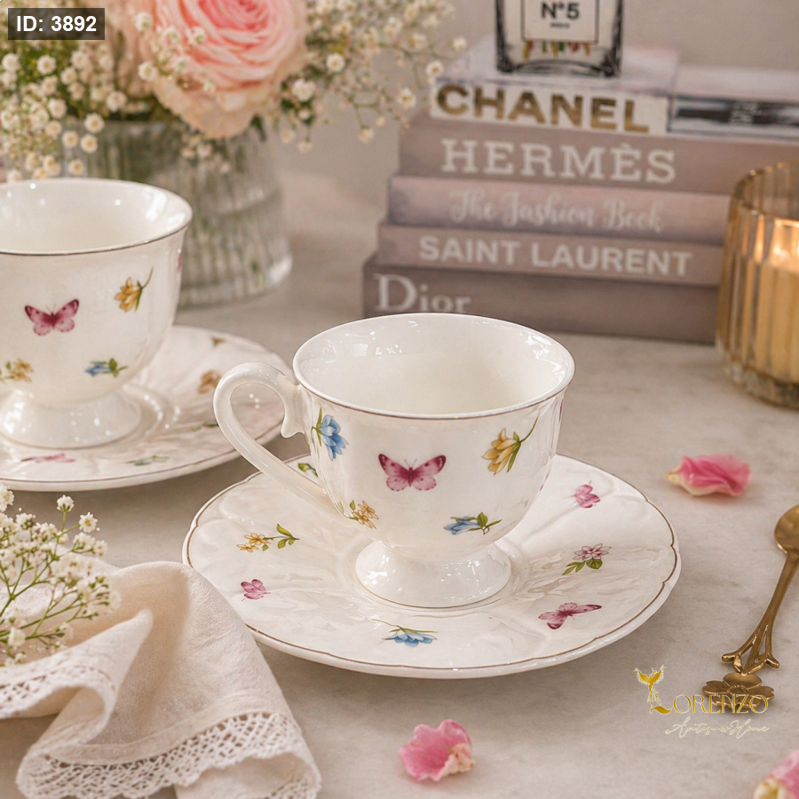طقم فناجين قهوة أنيق مكوّن من 6 فناجين مع صحونهم، بتصميم كلاسيكي ناعم يضيف لمسة راقية لكل جلسة قهوة. يتميز الطقم بلونه الأبيض الهادئ المزخرف برسومات زهور وفراشات صغيرة بألوان جذابة وناعمة، تعكس الذوق الرفيع وتمنح طاولة التقديم لمسة فخامة مميزة.