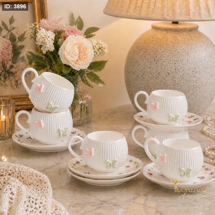طقم فناجين شاي أنيق مكوّن من 6 فناجين مع صحونهم، بتصميم راقٍ يجمع بين البساطة واللمسات الناعمة التي تضيف جمالًا خاصًا لكل جلسة شاي. يتميز الطقم بلونه الأبيض النقي مع تفاصيل فراشات بارزة بألوان هادئة مثل الأخضر الفاتح والزهري، ما يمنحه طابعًا أنثويًا راقيًا ومظهرًا مميزًا.
