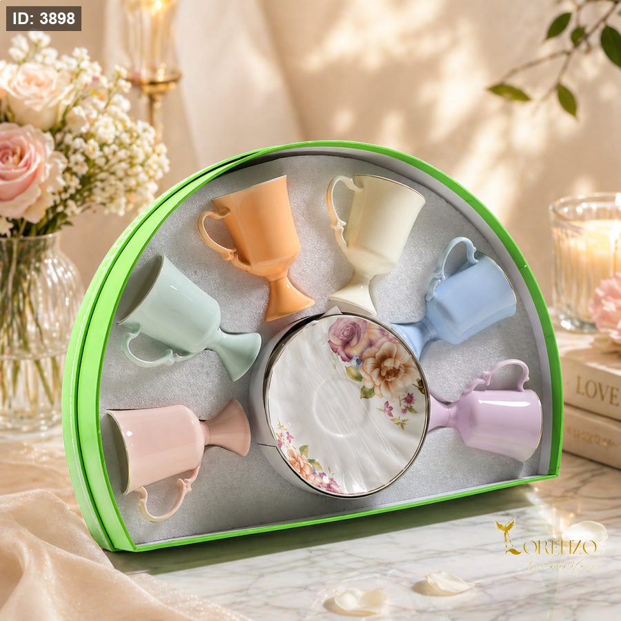 طقم فناجين قهوة مميز مكوّن من 6 فناجين بتصميم أنيق وعصري يضيف لمسة راقية لأي جلسة قهوة. يتميز الطقم بألوانه الهادئة والمتناسقة التي تعكس الذوق الرفيع، مع تفاصيل ناعمة ونقوش زهرية تضفي جمالاً فريداً على كل قطعة.