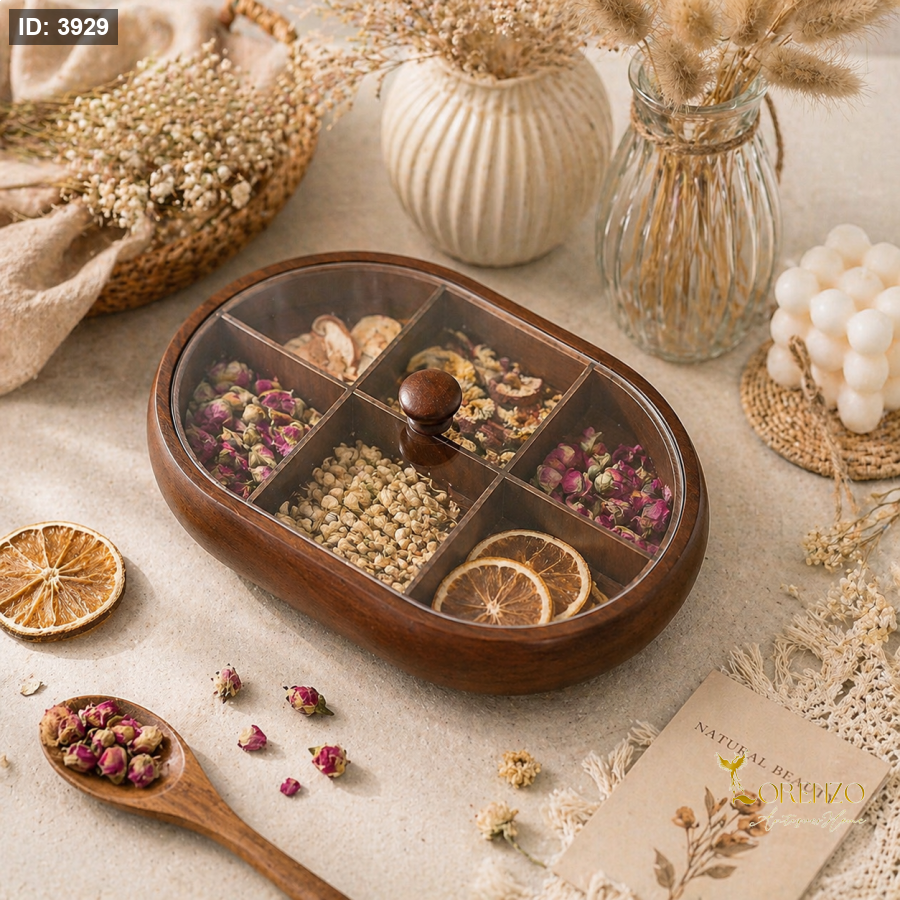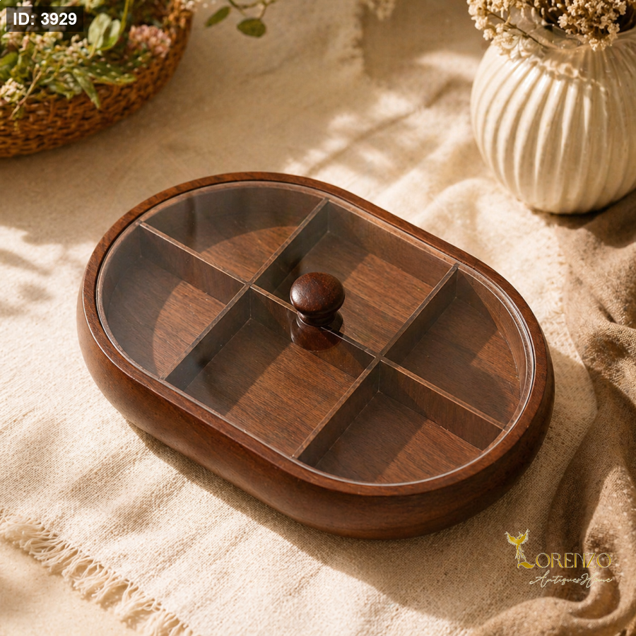 مضيفة بيضاوي خشب بتصميم أنيق وعصري مع غطاء من الأكريلك الشفاف، تجمع بين الفخامة والعملية لتقديم الضيافة بشكل مرتب وجذاب. مصنوعة من خشب عالي الجودة بلمسة طبيعية دافئة، ومقسمة من الداخل لعدة خانات تساعدك على تنظيم المكسرات، الحلويات، أو الضيافة المتنوعة بكل سهولة.